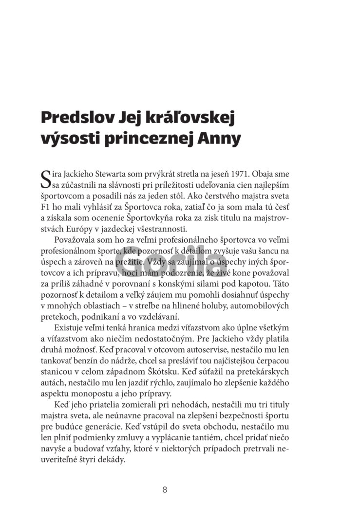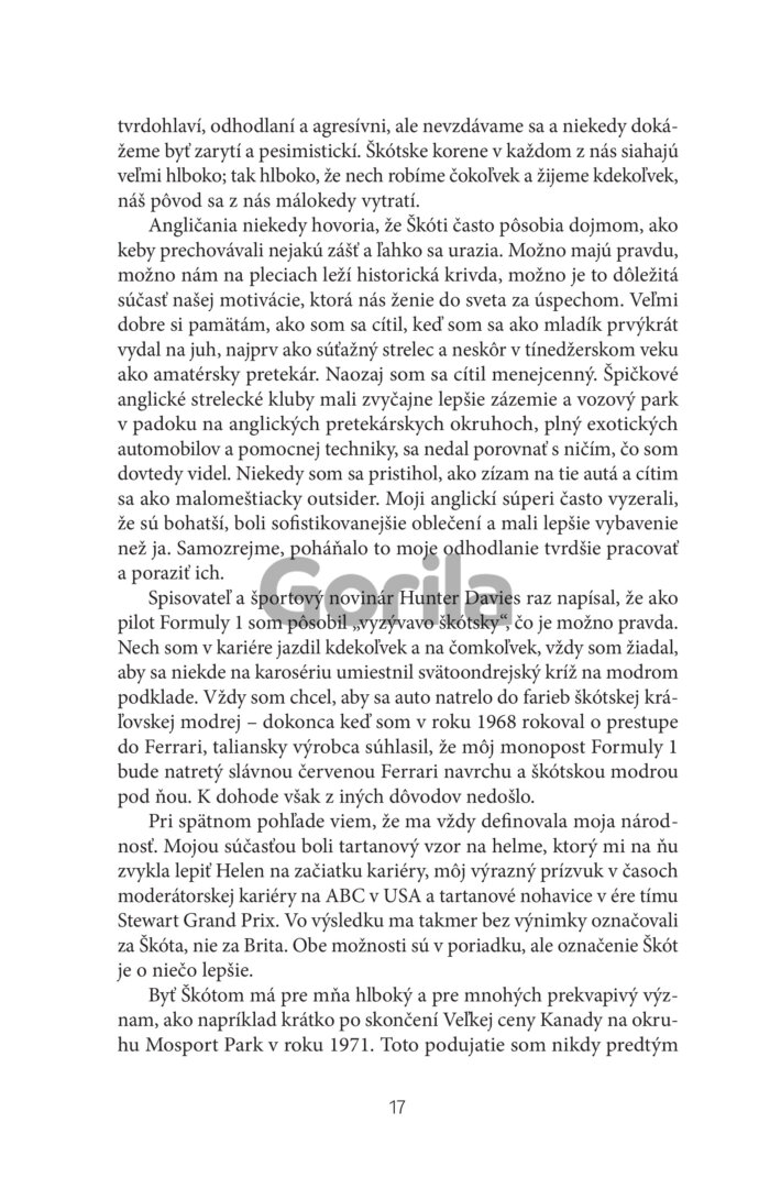 Jackieho autobiografia nerozpráva iba príbeh o víťazstvách. Sleduje životnú dráhu škótskeho chlapca z robotníckej rodiny, ktorý sa presadil v najnebezpečnejšom období histórie F1. Od legendárnych okruhov až po rokovacie sály veľkého biznisu, Stewartov život je plný triumfov a odvahy meniť veci k lepšiemu. Navždy zmenil bezpečnosť Formuly 1. Súťažil po boku legiend, lámal rekordy a vytvoril odkaz, ktorý presahuje svet motošportu.
