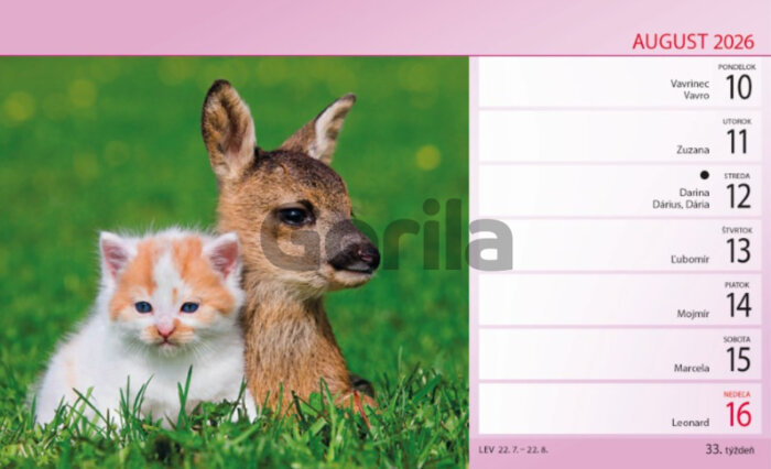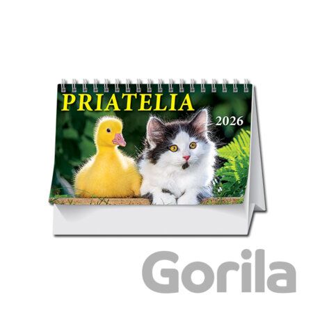 Týždenný stolový kalendár Priatelia prináša krásne a milé fotografie zvieracích priateľov: psíkov, mačiek, zajačikov, vtáčikov a ďalších obľúbených domácich zvierat. Každý týždeň Vám spestrí nový zvierací kamarát, ktorý vyčarí úsmev na tvári a spríjemní pracovný či domáci deň. Ideálny darček pre deti ale aj všetkých milovníkov zvierat.