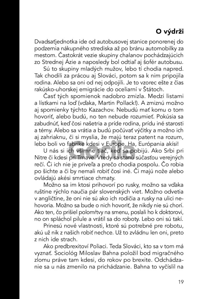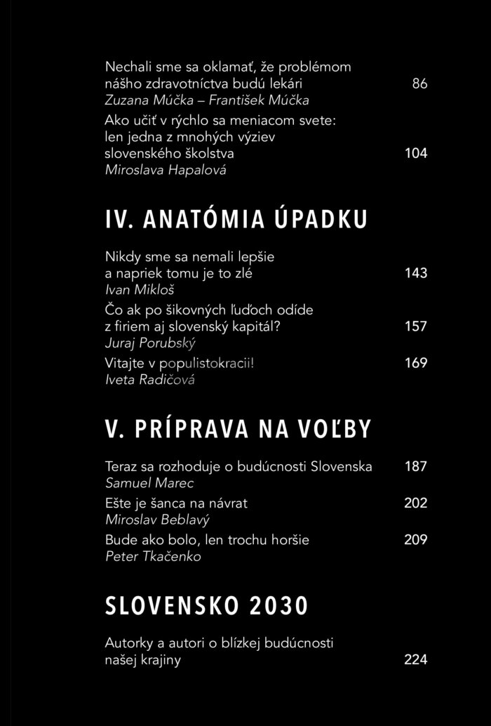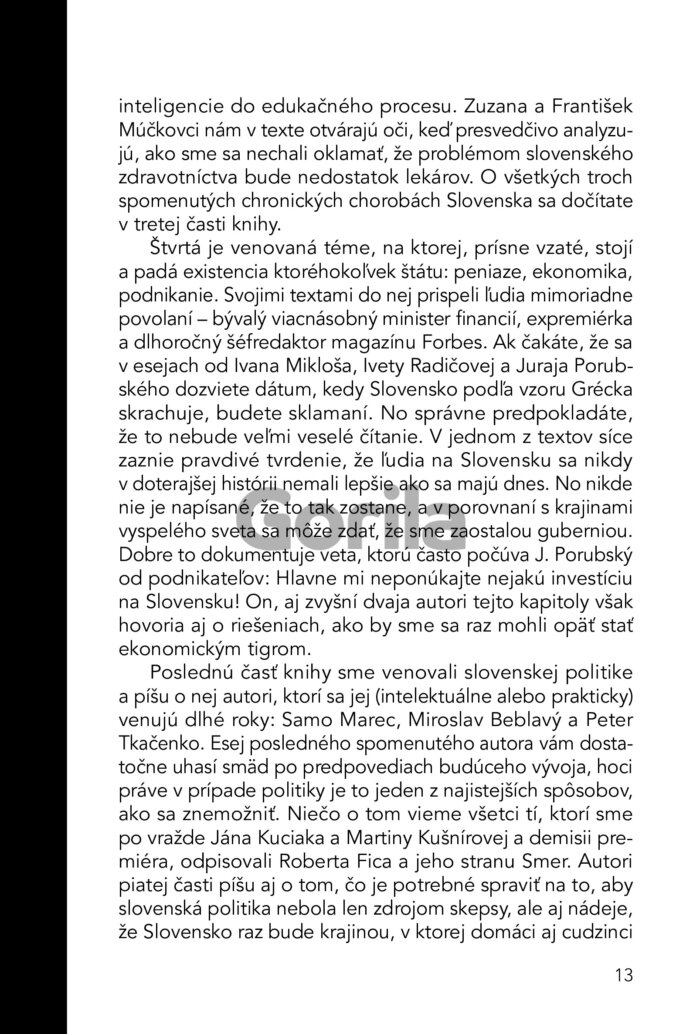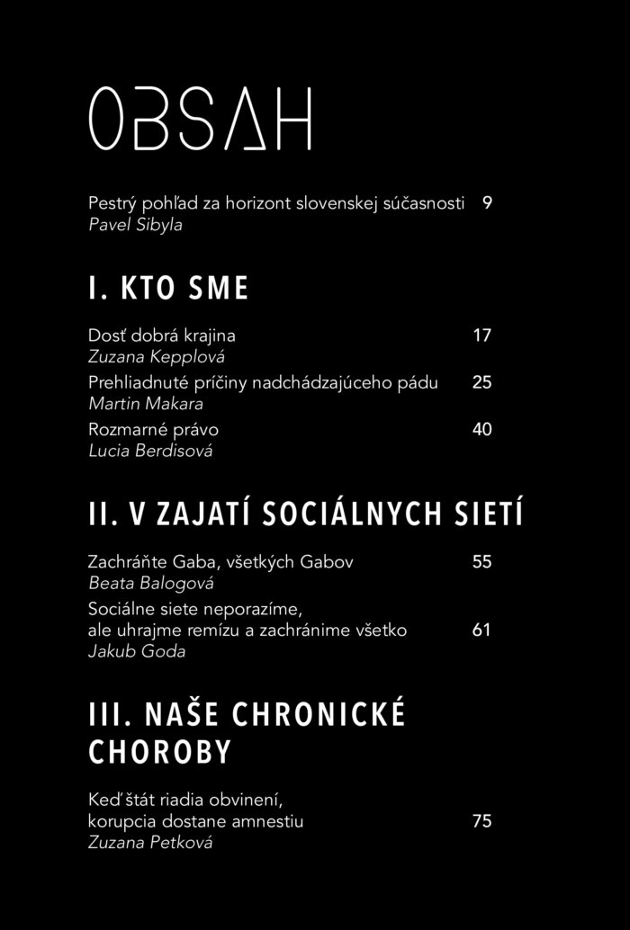 Editorom projektu je spisovateľ a publicista Pavel Sibyla. V knihe si prečítate eseje, v ktorých sa autorský kolektív často dopĺňa, inokedy si protirečí alebo upriami vašu pozornosť na tému, ktorej dôležitosť si v každodennom zhone nestíhate uvedomiť. Texty sa dotýkajú tém ako politika, školstvo, zdravotníctvo, sociálne siete, ekonomika, korupcia či právny štát a ponúkajú aj prognózy vývoja, kam sa Slovensko posunie a ako bude vyzerať v roku 2030.