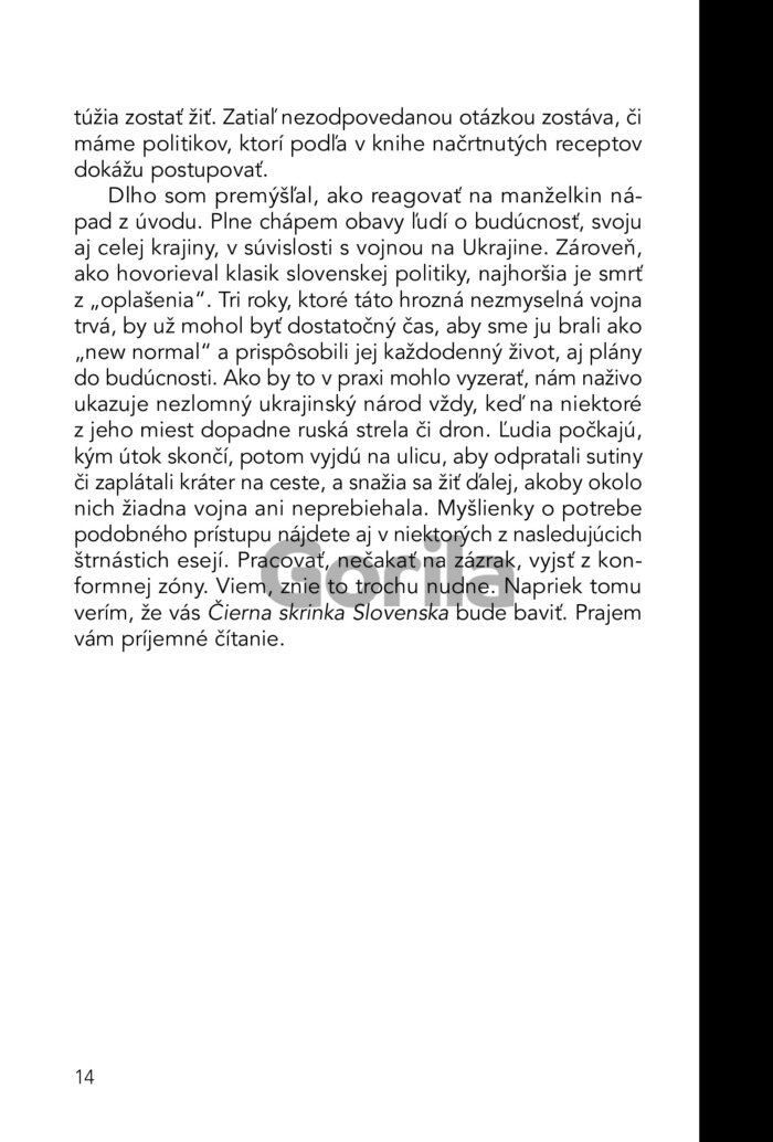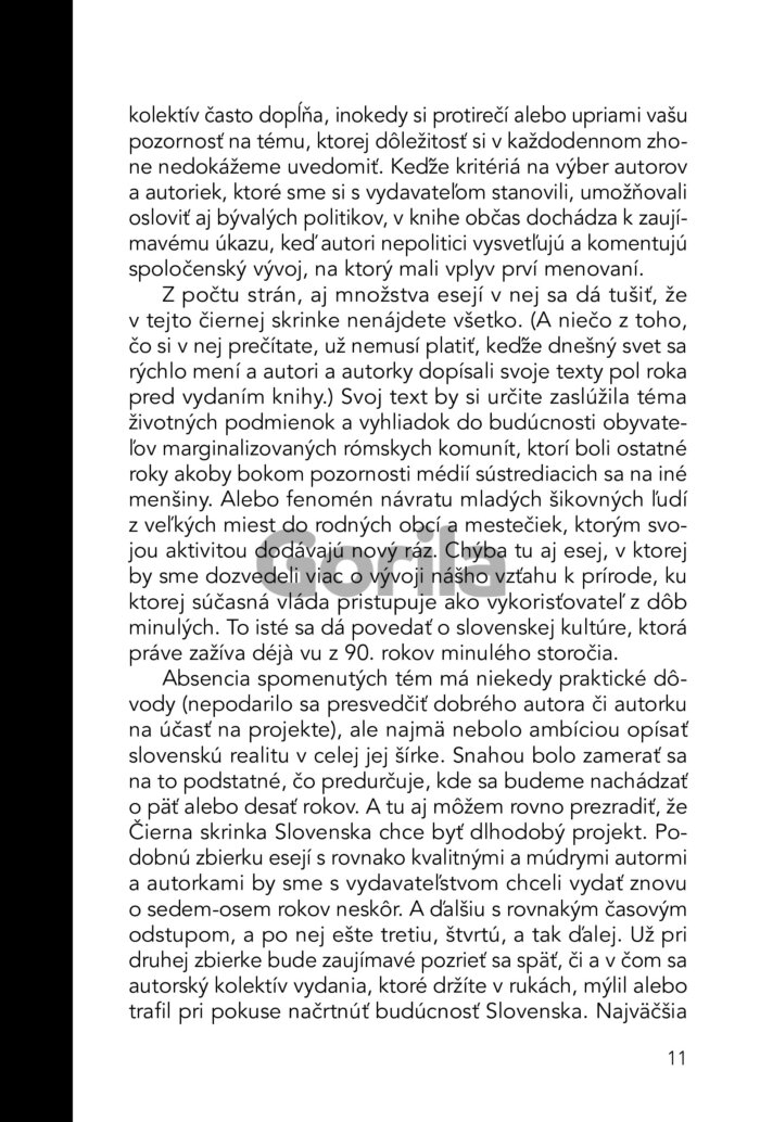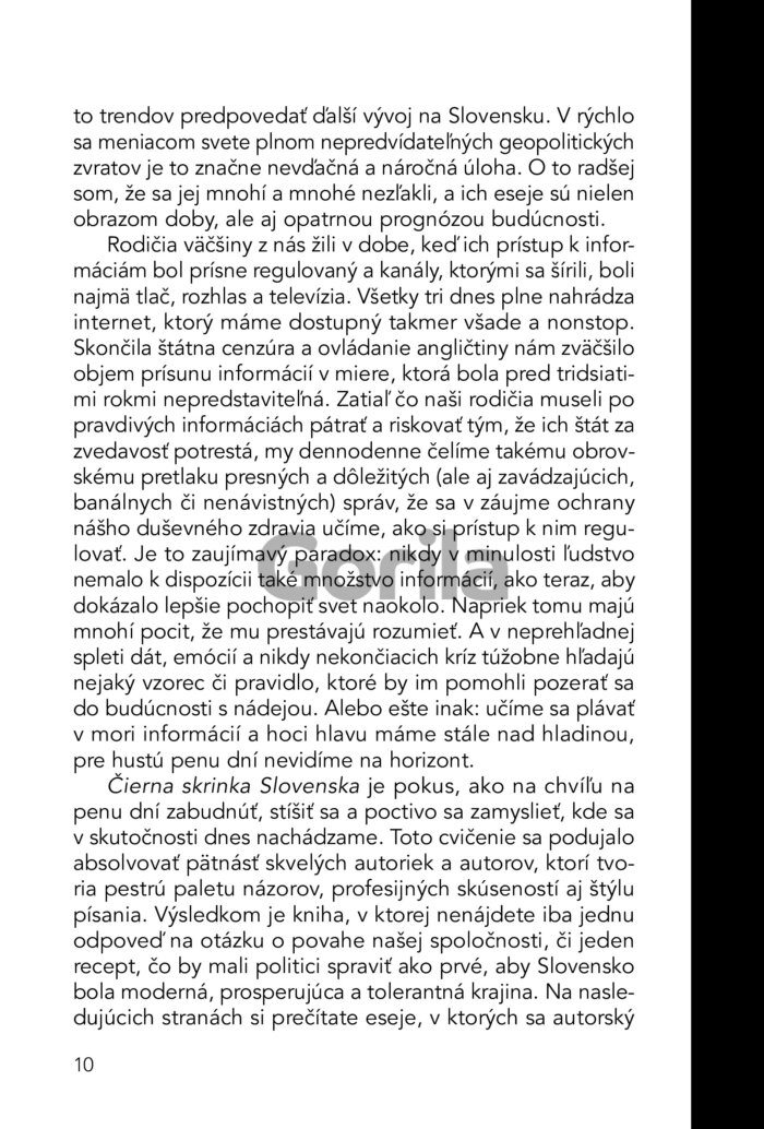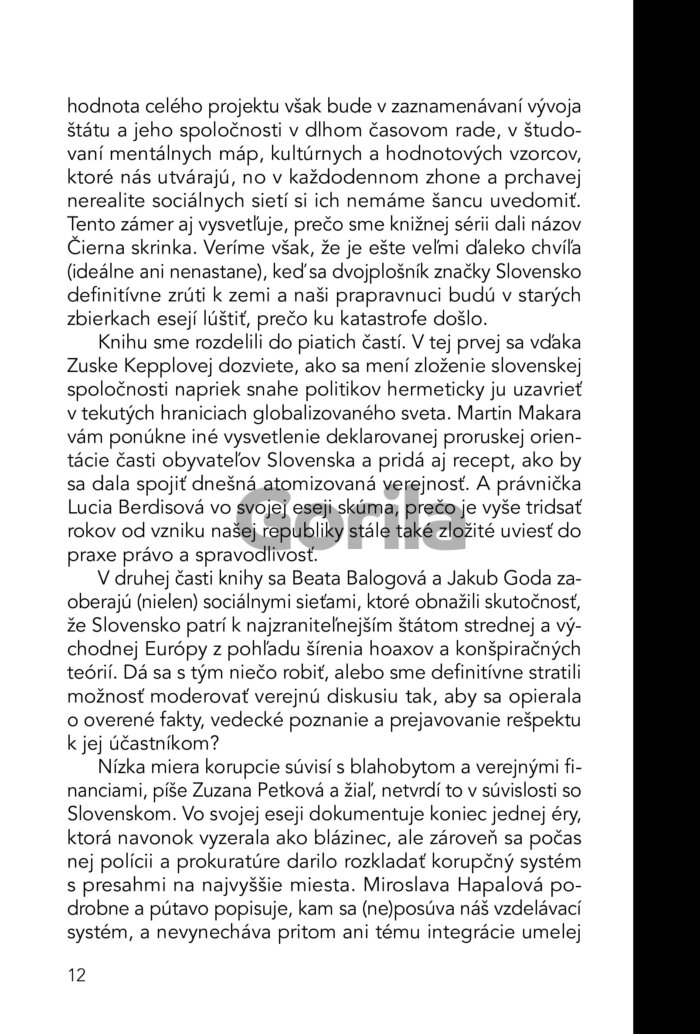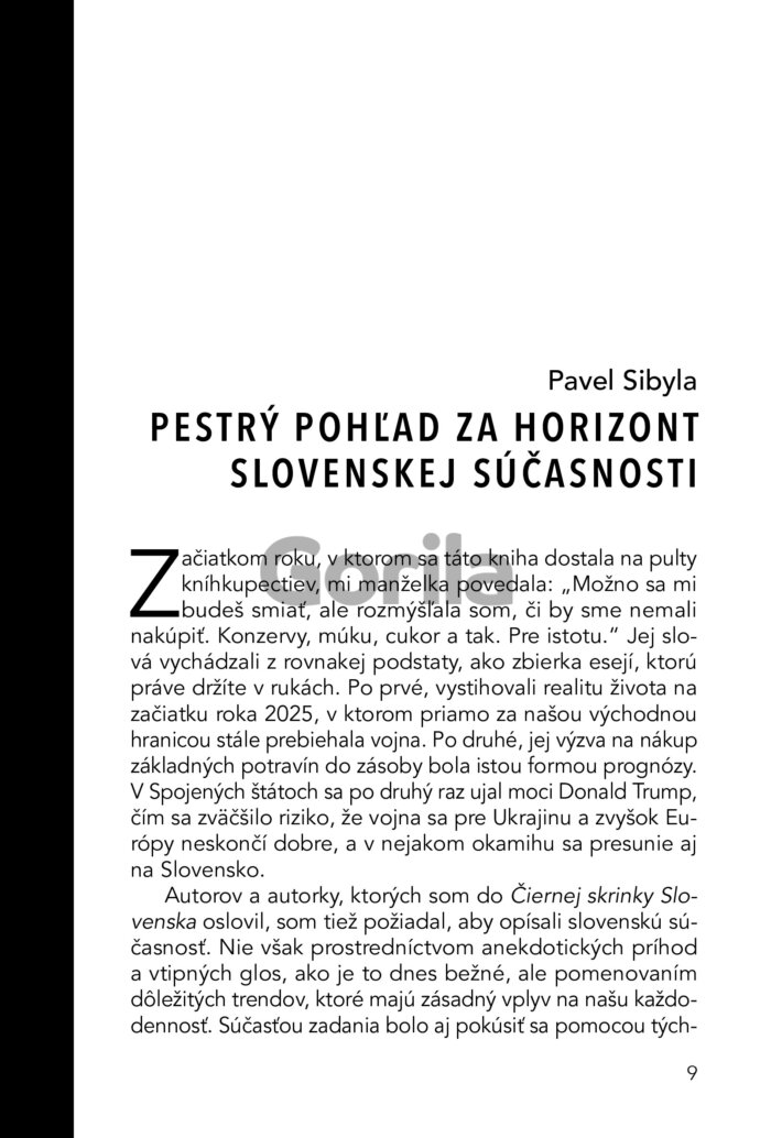 Čierna skrinka Slovenska je unikátnou zbierkou textov, ktoré sa zamýšľajú nad tým, kde sa v skutočnosti dnes ako štát a spoločnosť nachádzame. Autorky a autori si kladú otázku, čo nás ovplyvnilo, či a kde sme spravili chyby a z čoho sa môžeme do budúcnosti poučiť. „Nabúrala“ naša krajina? Ak áno, je načase nájsť pomyselnú čiernu skrinku a zistiť, čo sa vlastne stalo.