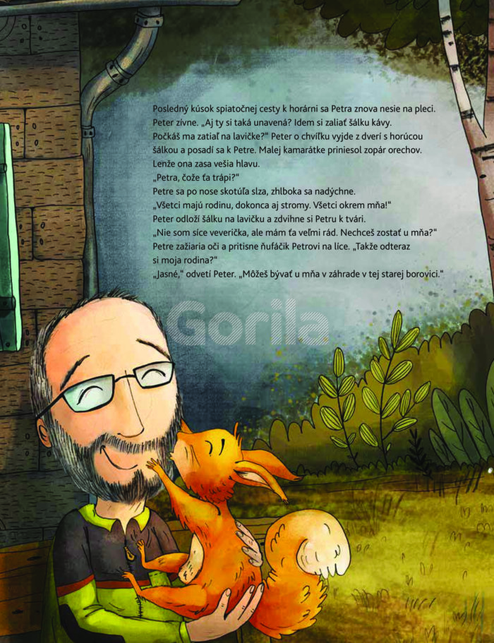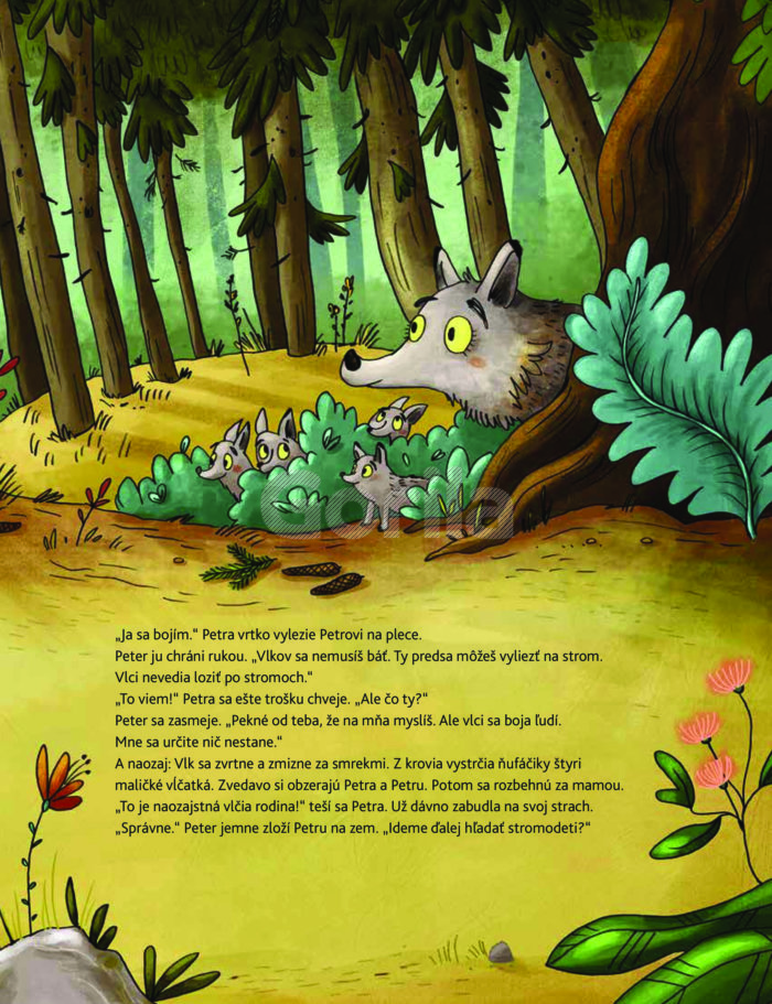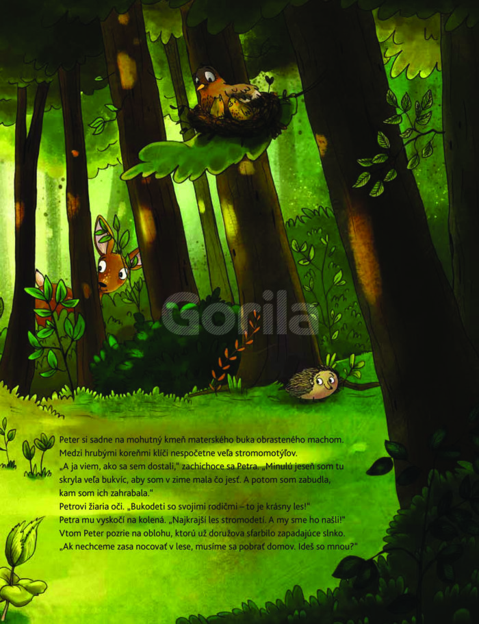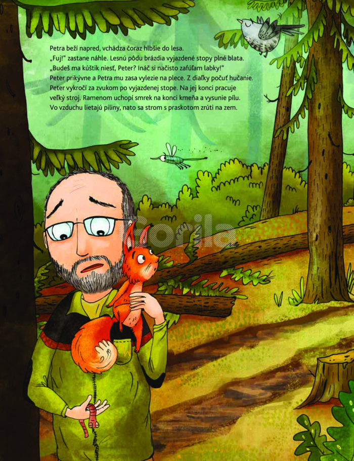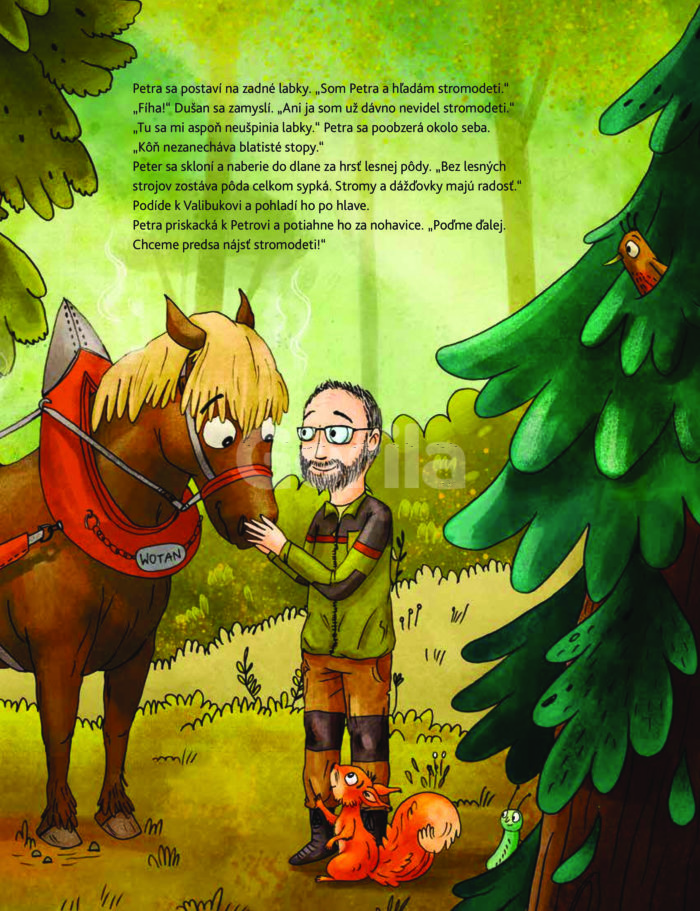 Najznámejší nemecký lesník Peter Wohlleben rozpráva v prvej obrázkovej knihe vrúcny príbeh. Dobromyseľný príbeh, ktorý deťom jedinečným spôsobom priblíži les a prírodu. Kde bývajú stromodeti? To by rada vedela malá veverička Petra. A prečo sa ľudia nemusia báť vlkov? Horár Peter vezme veveričku na dobrodružnú lesnú potulku. Cestou prespia pod šírym nebom, upúta ich rúbanie ihličnatých stromov a naozaj stretnú vlka! Ale podarí sa im nájsť aj stromodeti a ich rodičov? A objavia rodinu, v ktorej Petra môže zostať?