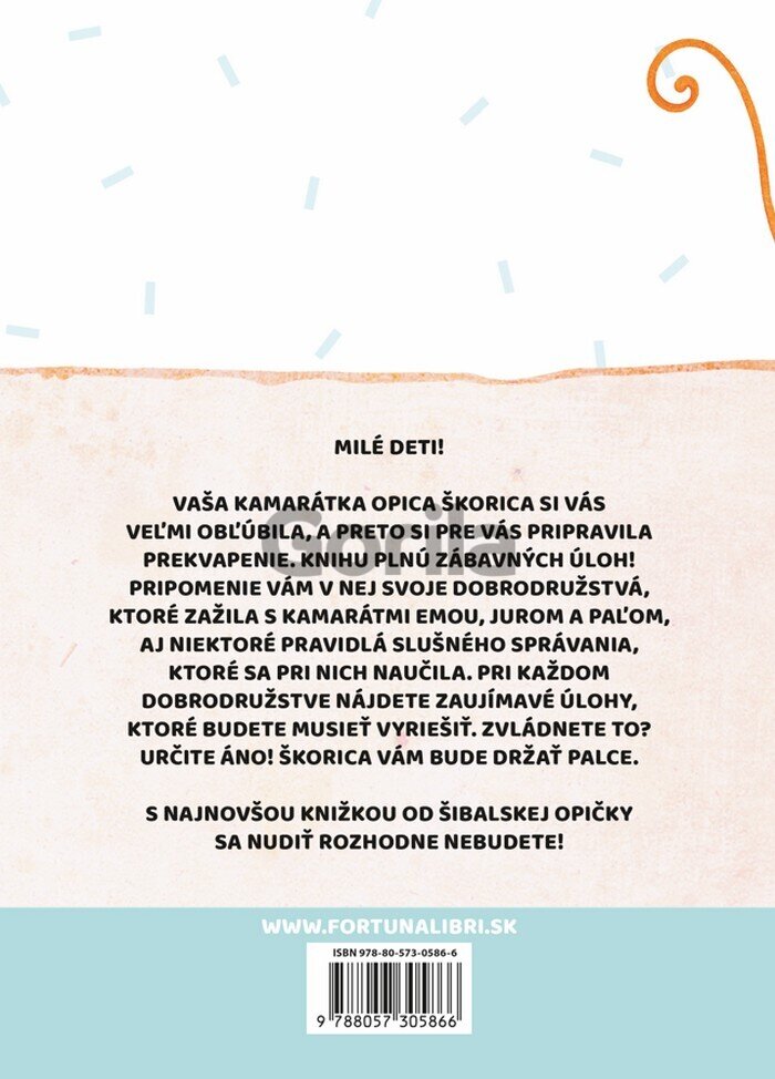 Vaša kamarátka opica Škorica si vás veľmi obľúbila, a preto si pre vás pripravila prekvapenie. Knihu plnú zábavných úloh! Pripomenie vám v nej svoje dobrodružstvá, ktoré zažila s kamarátmi Emou, Jurom a Paľom, aj niektoré pravidlá slušného správania, ktoré sa pri nich naučila. Pri každom dobrodružstve nájdete zaujímavé úlohy, ktoré budete musieť vyriešiť. Zvládnete to? Určite áno! Škorica vám bude držať palce.