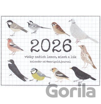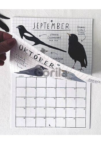 Nástenný ilustrovaný kalendár veľkosti A5 (na šírku), s dierkou na zavesenie, s tematikou vtákov našich lesov, miest a lúk.