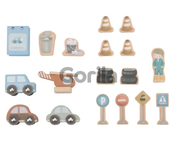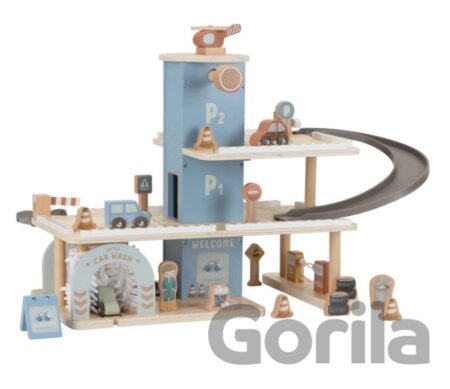 Zaparkuj, natankuj a hurá na výlet! Garáž má prízemie s umývačkou, dve poschodia na parkovanie, nabíjaciu stanicu pre elektromobily a pristávaciu plochu pre vrtuľník na streche. V balení ďalej nájdete tri drevené autíčka, vrtuľník, figúrku vodiča a ďalšie doplnky.