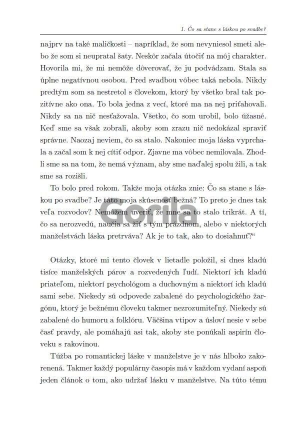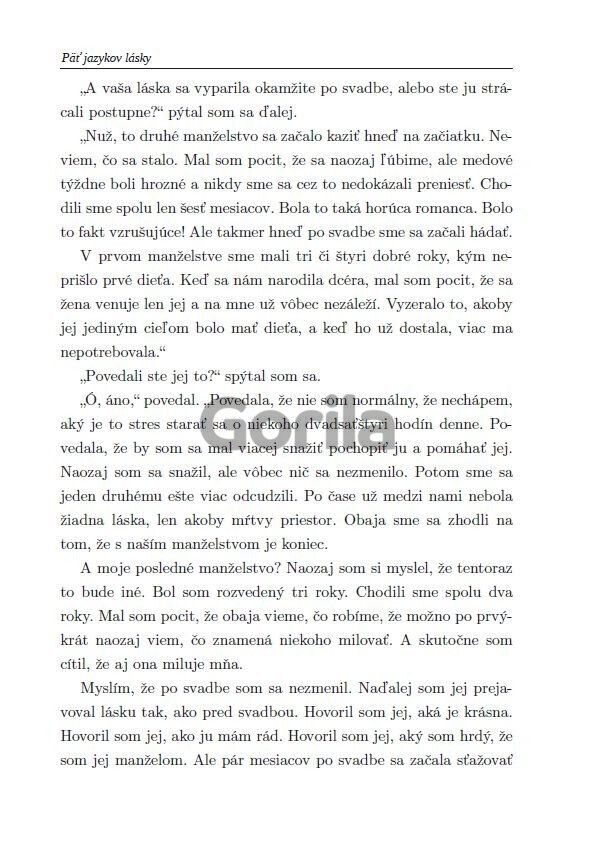 Niekto túži po pozornosti, iný po pochvale; pre niekoho sú veľmi dôležité darčeky, pre ďalšieho vymenená žiarovka či ožehlená košeľa a zas iný potrebuje fyzický dotyk. Kniha vám objasní každý z týchto jazykov, pomôže vám objaviť jazyk lásky vás a vášho partnera a dozviete sa aj, ako prakticky týmto jazykom hovoriť.