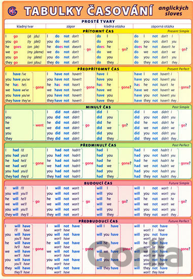 Přehledné tabulky všech dvanácti anglických časů - kladný tvar, zápor, kladná otázka, záporná otázka. Vyčasované sloveso go (jít). Barevné značení koncovek a nepravidelností.