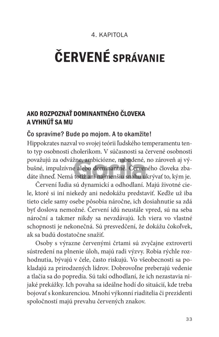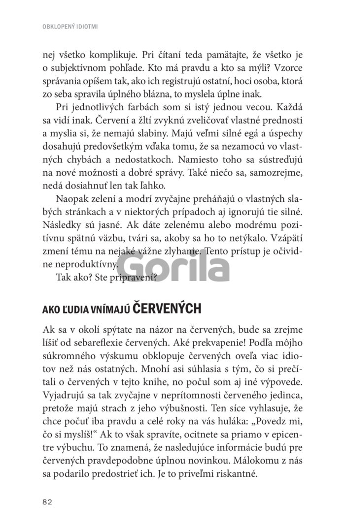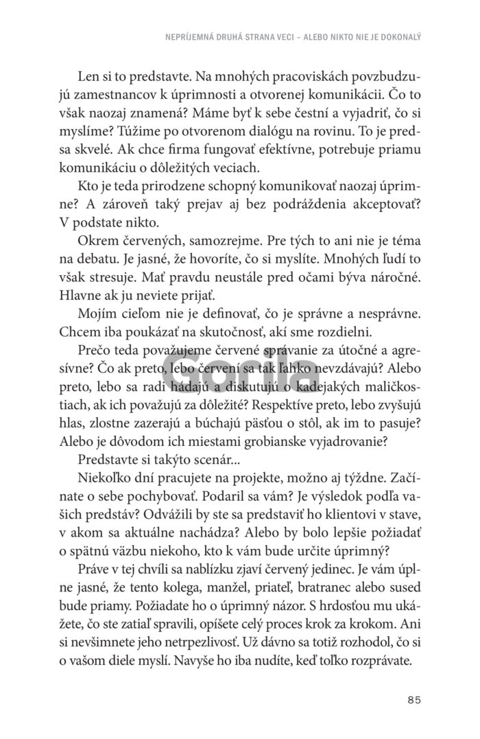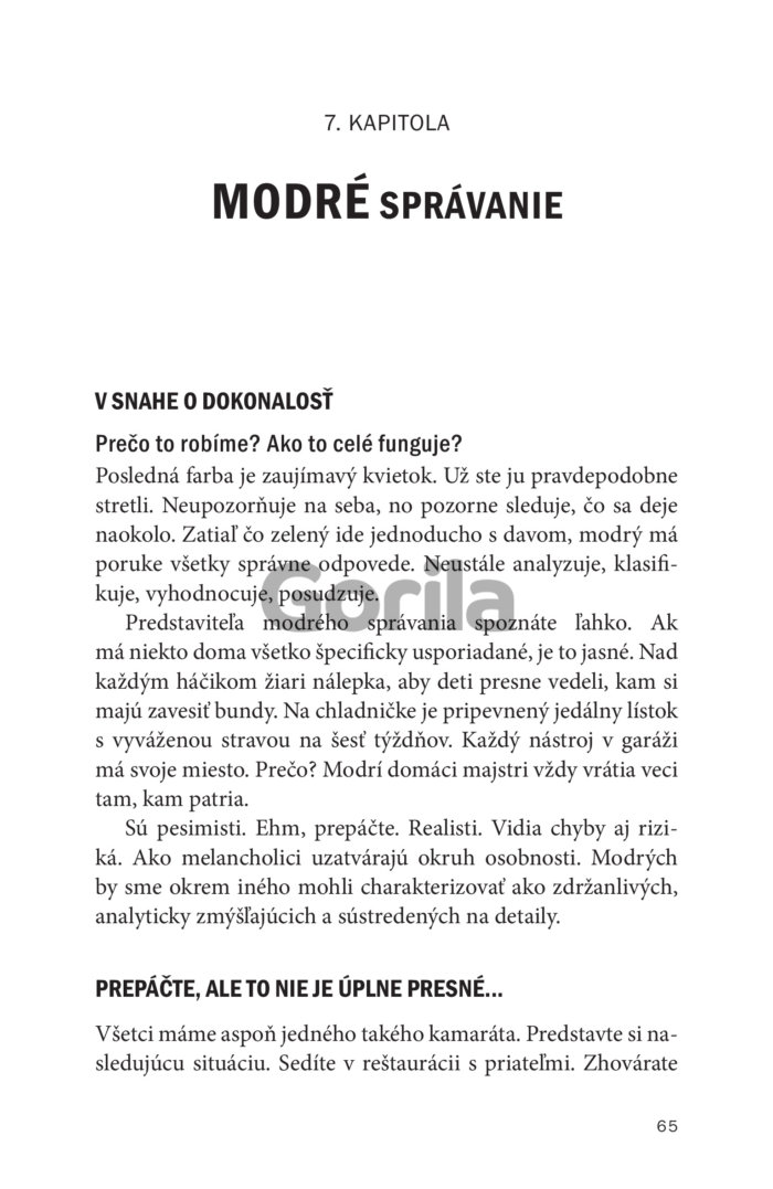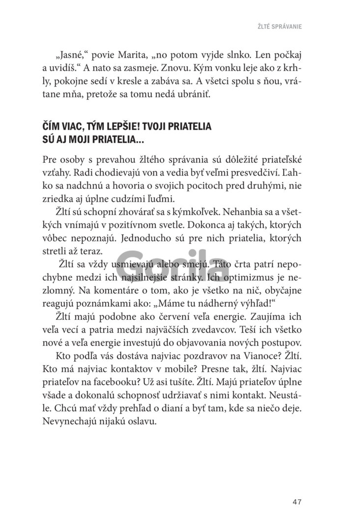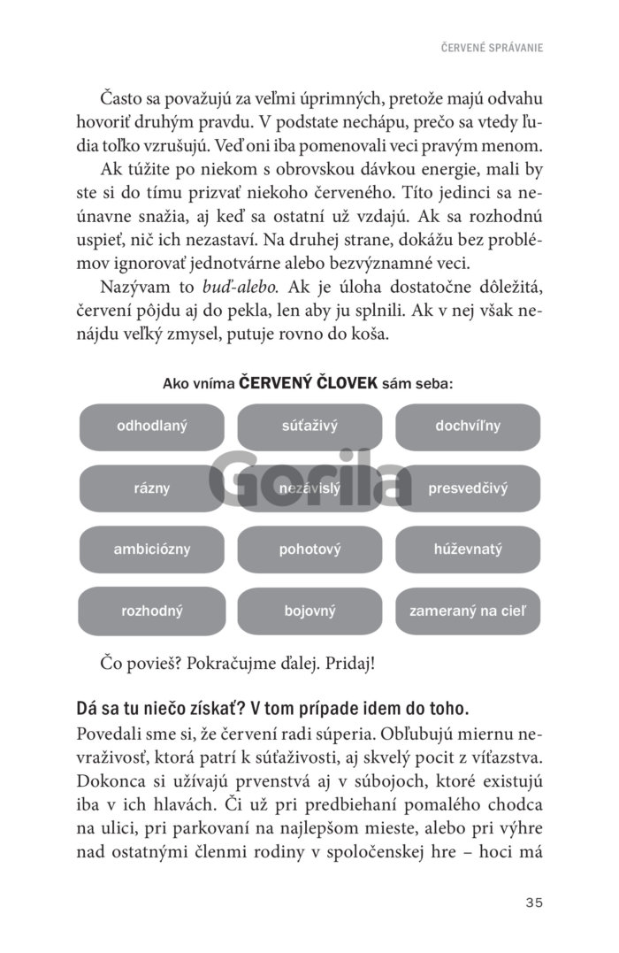 Škandinávsky bestseller, z ktorého sa po celom svete predalo už milión kópií, vysvetľuje štyri základné typy ľudského správania, ktoré definujú spôsob komunikácie a vnímania ľudí okolo nás. Červení sú dominantní a panovační. Žltí sú sociálnejší a majú v sebe viac optimizmu. Zelení sú zasa uvoľnení a kamarátski. No a modrí oplývajú analytickým myslením a presnosťou. Autor Thomas Erikson vám naozaj vtipným spôsobom vysvetlí, ako komunikovať s každým z nich.