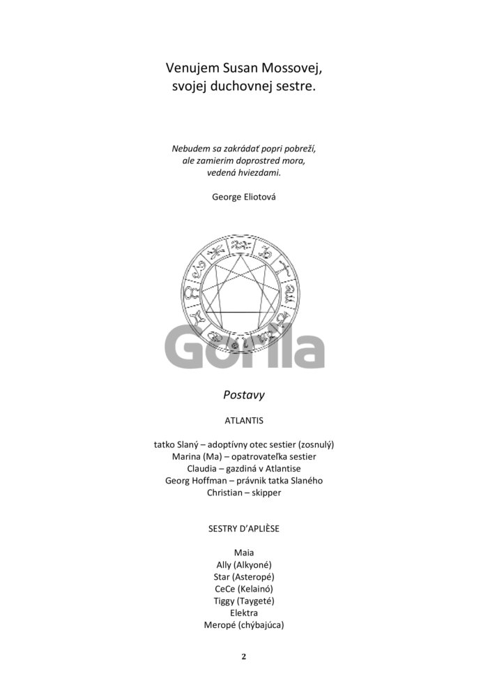 Strhujúci druhý diel historicko-romantickej série o neuveriteľných osudoch nevlastných sestier Maie, Ally, Star, Cece, Tiggy, Electry a Meropé vychádza z mytologického príbehu o Plejádach, siedmich sestrách, ktoré Zeus umiestnil na oblohu v podobe žiarivej hviezdokopy.