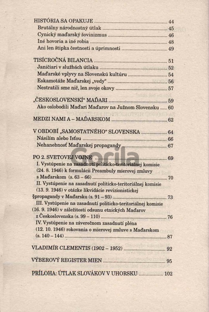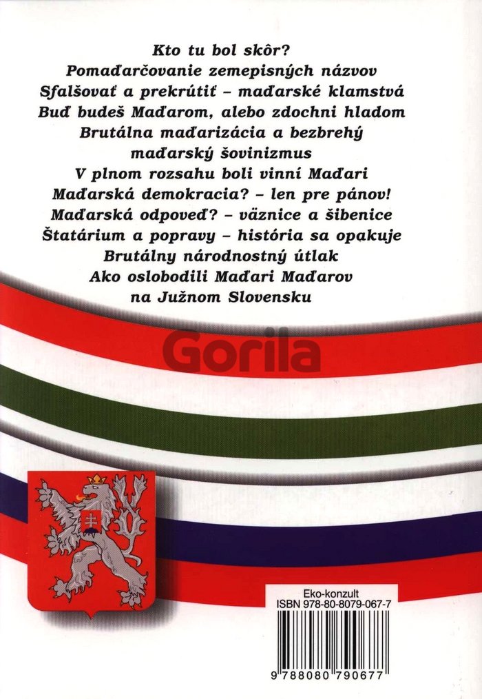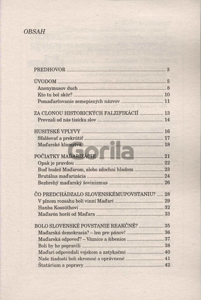 Tento výrazne a otvorene protimaďarský spis prináša rôzne informácie a historické skutočnosti, ale aj autorove osobné interpretácie a postoje. Pomaďarčovanie, brutálny národnostný útlak, kto bol skôr na našom území, maďarské klamstvá a prekrúcania vecí, väznice a šibenice, južné Slovensko...
