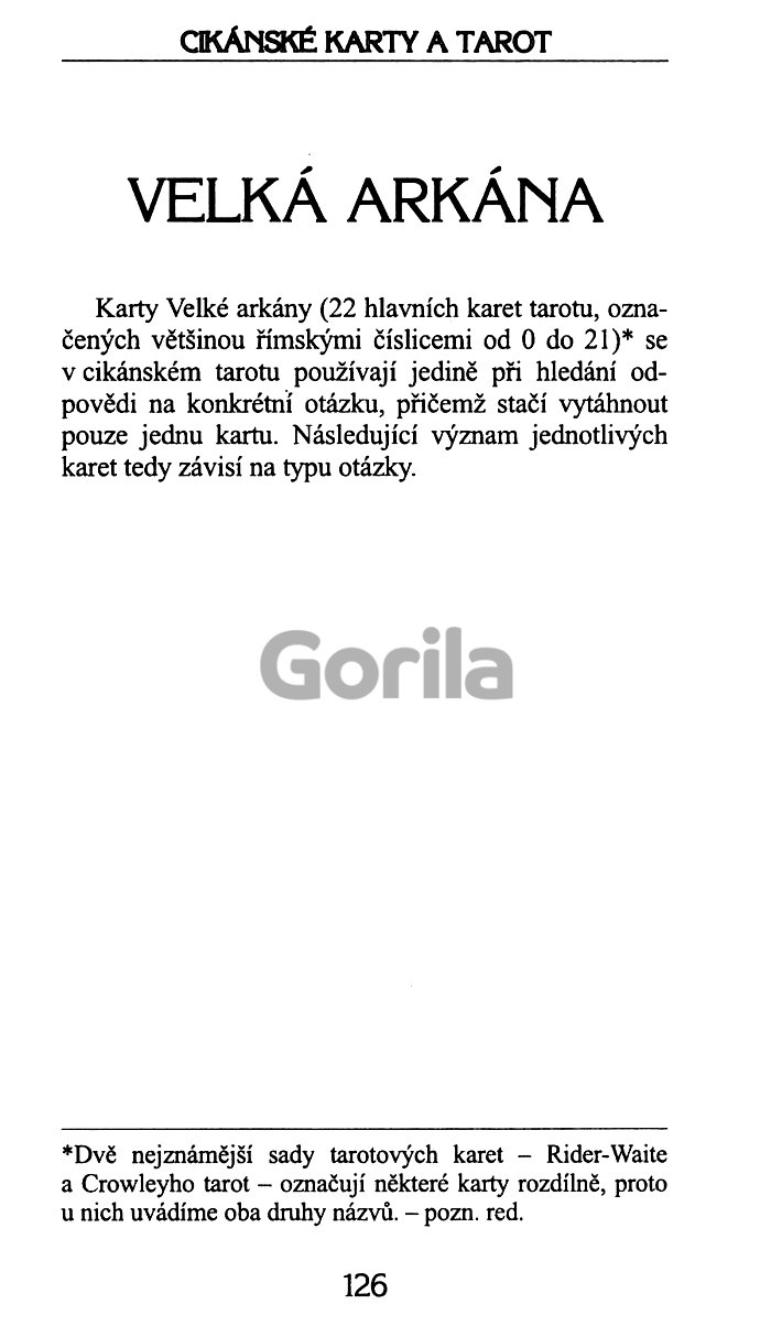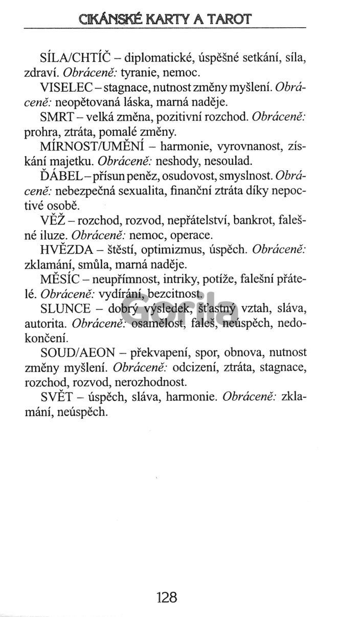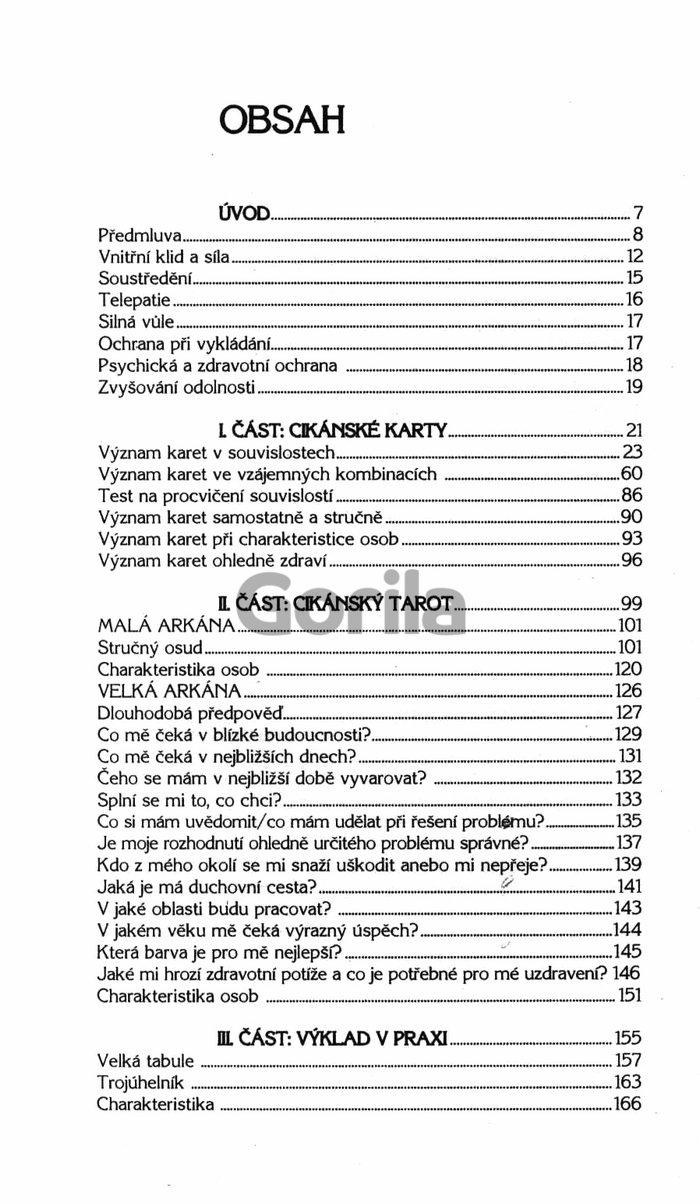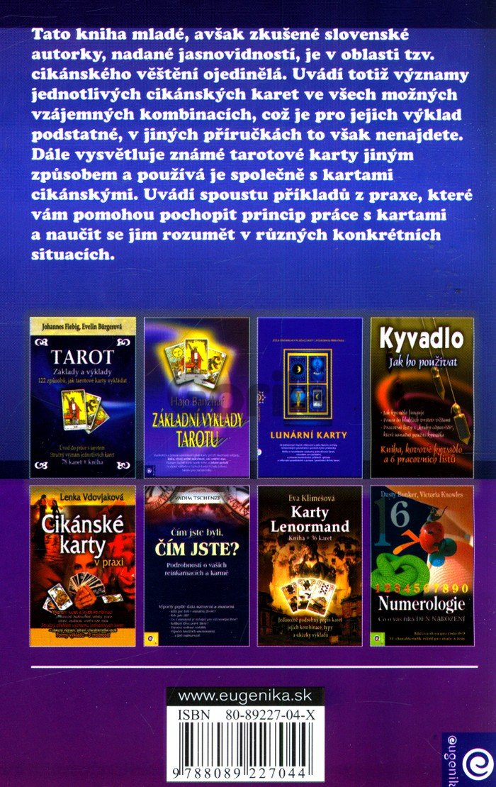 Jedinečná kniha o vykladaní cigánskych kariet. Nájdete tu význam každej karty jednotlivo, ale aj význam ich vzájomných kombinácií vo vyčerpávajúcom zozname každá s každou. Druhá časť vysvetľuje tarotové karty novým spôsobom. Tretia časť uvádza rôzne spôsoby práce s kartami a ku každému pridáva množstvo ilustračných príkladov z praxe.