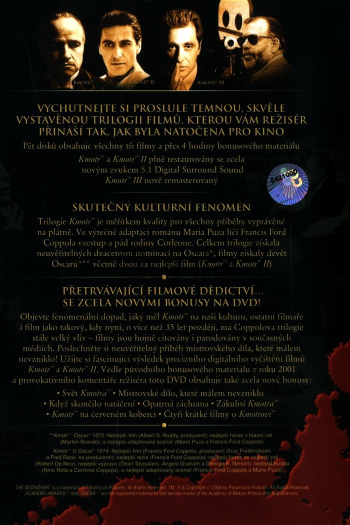 Originálny názov: Godfather - The Coppola Restoration trilogy Katalógové číslo: 1813 Rozmer: 135×190 mm Dĺžka: 540 Obal: DVD obal Titulky: české, anglické, poľské, rumunské, bulharské Jazyk: čeština, angličtina