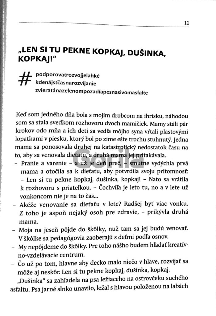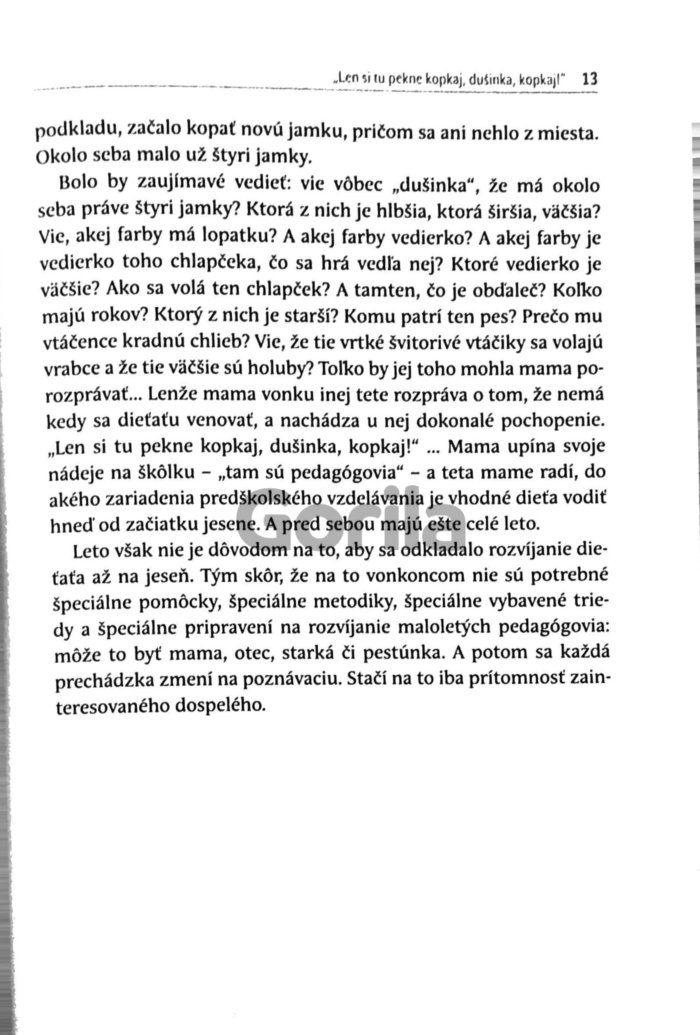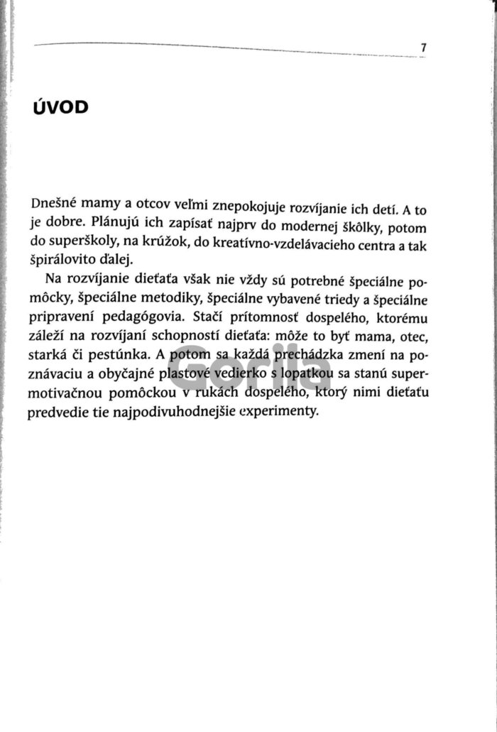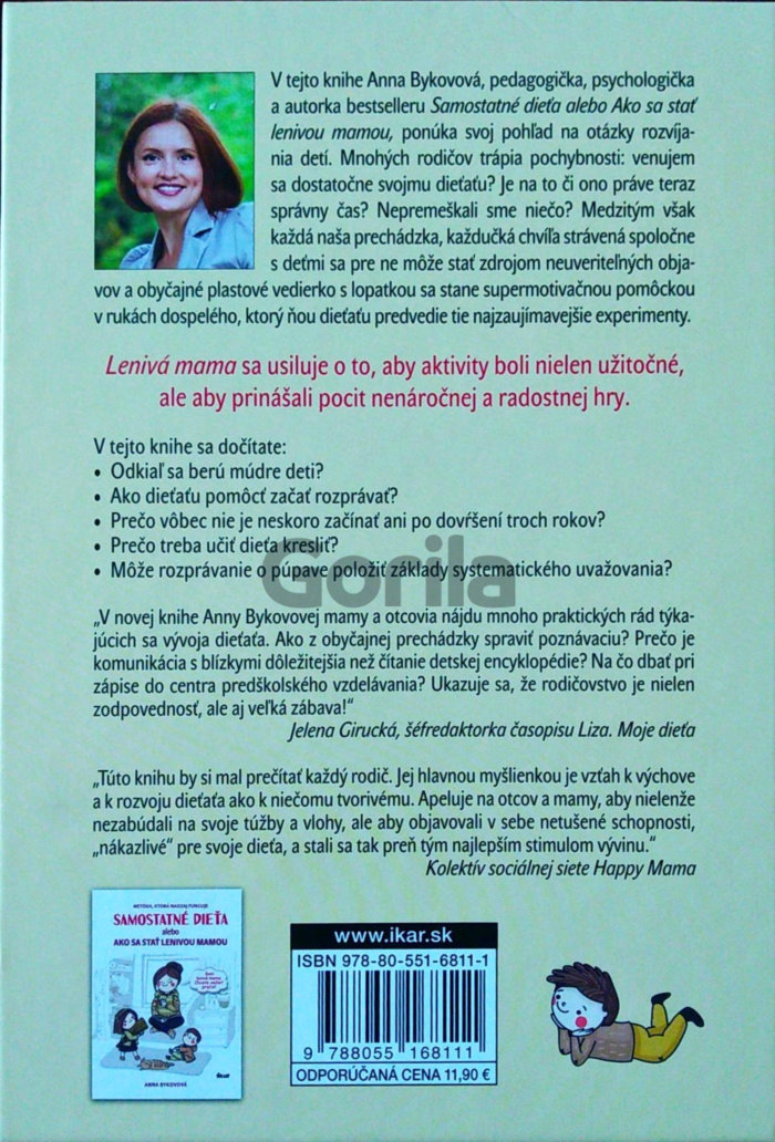 V tejto knihe Anna Bykovová, pedagogička, psychologička a autorka bestselleru Samostatné dieťa alebo Ako sa stať lenivou mamou, ponúka svoj pohľad na otázky rozvíjania detí. Mnohých rodičov trápia pochybnosti: venujem sa dostatočne svojmu dieťaťu? Je na to či ono práve teraz správny čas? Nepremeškali sme niečo? Medzitým však každá naša prechádzka, každučká chvíľa strávená spoločne s deťmi sa pre ne môže stať zdrojom neuveriteľných objavov a obyčajné plastové vedierko s lopatkou sa stane supermotivačnou pomôckou v rukách dospelého, ktorý ňou dieťaťu predvedie tie najzaujímavejšie experimenty.