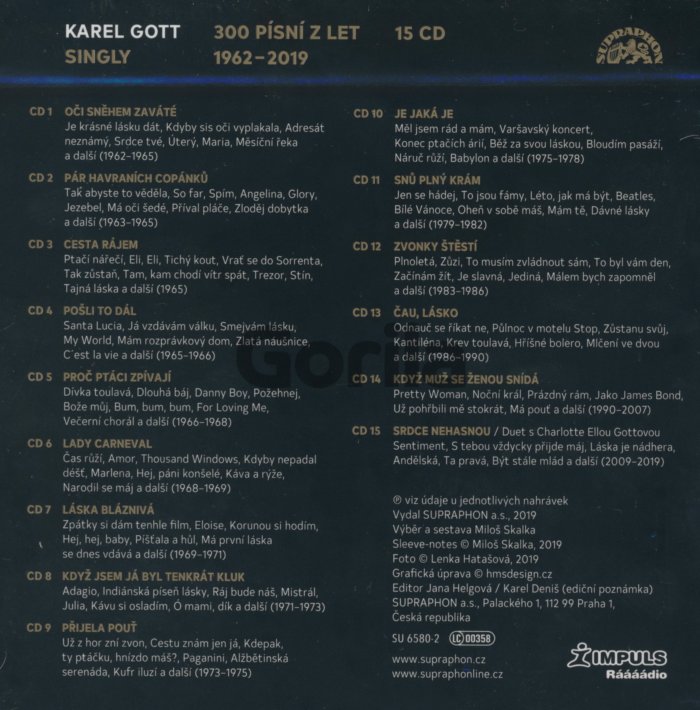 Velký výroční výběr Gottových singlových a épéčkových nahrávek, zahrnující období od počátku šedesátých let do současnosti. Tři sta skladeb, téměř kompletní pohled na postupné proměny hudby, textů i aranží. Důkaz mnohostrannosti talentu zpěváka, jeho úspěšného sledování světových trendů i vynikajícího repertoáru domácí provenience. Kompilátor Miloš Skalka shromáždil možné maximum áčkových SP a EP písniček Karla Gotta z katalogu Supraphonu, bohatě doplněných hitovými ukázkami z alb či rádiových a video singlů všech dalších tuzemských vydavatelů. Patnáct chronologických celků, pojmenovaných podle zásadních písní toho kterého období. Nově remasterovaná CD v samostatných barevných obalech, vybavených originálními titulkami singlů a sadou údajů. 44 stran bookletu, shrnutí Gottovy umělecké kariéry, rozhovor se zpěvákem, hudební životopis a komentáře, řada historických i nových fotografií. To vše umístěno ve speciálním, jen pro tuto příležitost vytvořeném kartonovém boxu. Komplet obsahuje aktuální velký hit Srdce nehasnou, duet s dcerou Charlotte Ellou Gottovou.