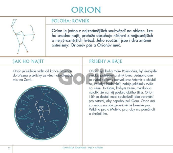 Přečtete si vzrušující příběhy a mýty vážící se ke každé skupině hvězd a naučíte se je na noční obloze hledat. Díky přesnému popisu polohy na mapě pak snadno najdete bájného lovce Oriona, Velkou medvědici a Malého medvěda a zjistíte, proč je po obloze honí Pastýř. Přečtěte si příběhy, které mají původ v dávné minulosti, otevřete oči a podívejte se v noci na nebe. Věřte, že noční oblohu uvidíte úplně jinýma očima!