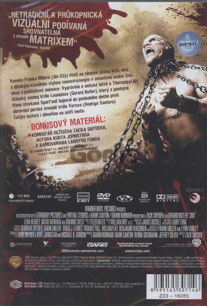 Originálny názov: 300 Rok vydania: 2007 Katalógové číslo: W00242 Rozmer: 135×190 mm Dĺžka: 112 Obal: DVD obal Titulky: české, anglické, rumunské, maďarské Jazyk: angličtina, čeština, maďarčina