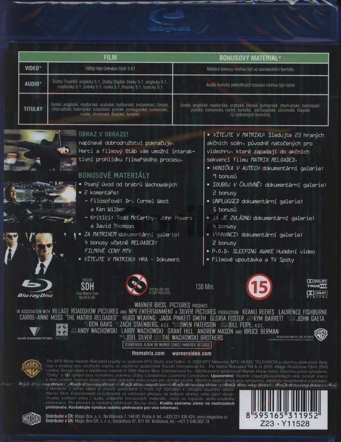 Originálny názov: The Matrix Reloaded Rok vydania: 2003 Katalógové číslo: 3734 Rozmer: 134×170 mm Dĺžka: 138 Obal: Blu-ray obal Titulky: české, anglické Jazyk: čeština, angličtina