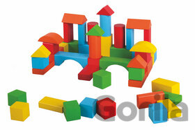 Barevná stavebnice obsahuje 50 kusů dřevěných kostek různých tvarů.