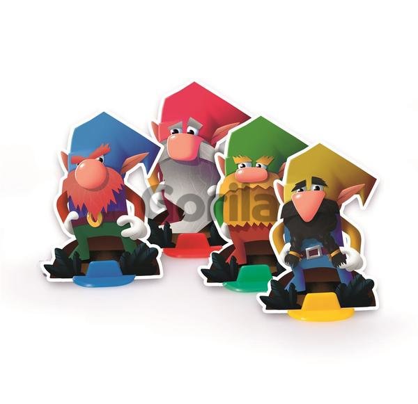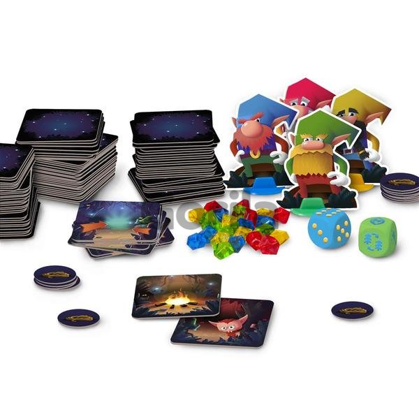 Balení obsahuje: 81 herních dílků, 16 diamantů, 15 žetonů vybavení, 4 figurky trpaslíků, 4 stojánky k figurkám, 1 kostku s body, 1 kostku se symboly