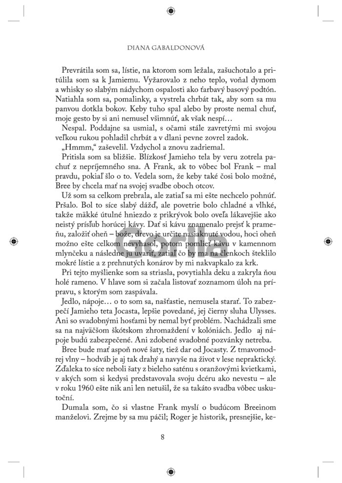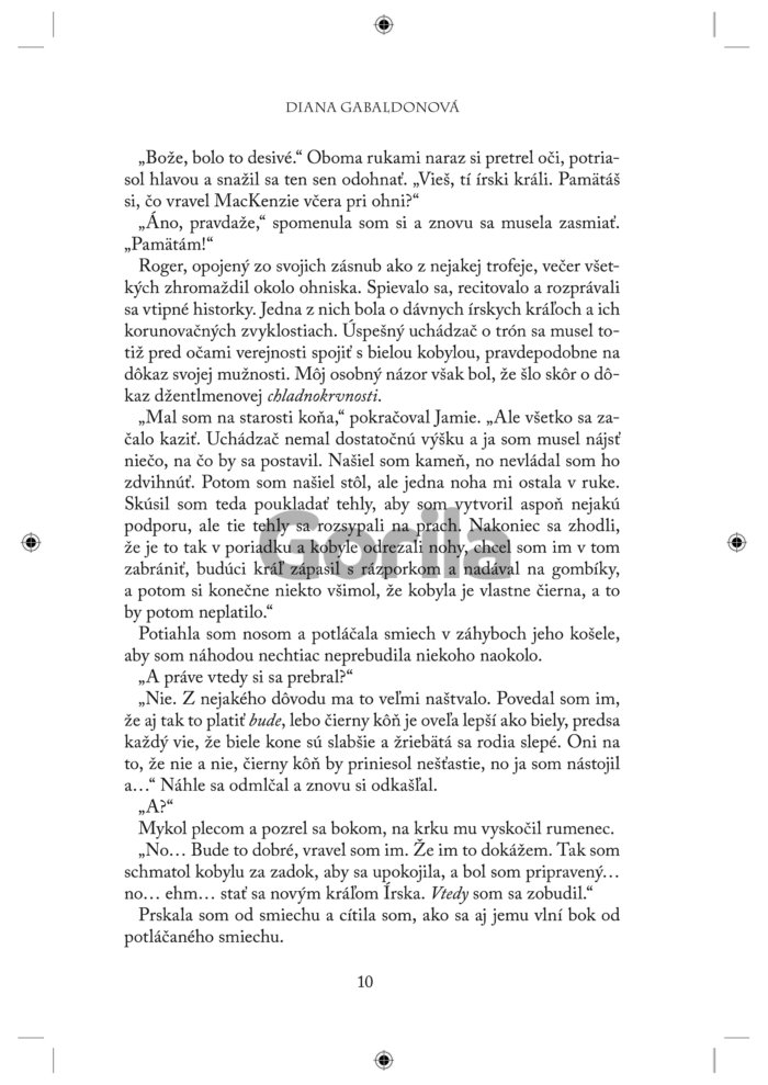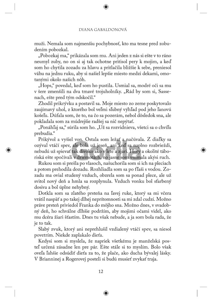 Diana Gabaldonová, autorka bestsellerov podľa New York Times, očarila čitateľov svojimi knihami ságy Outlander ovenčenými mnohými cenami. Dosiaľ vyšli štyri príbehy o Jamiem Fraserovi, Škótovi z 18. storočia a jeho žene, Claire Randallovej, cestovateľke časom z 20. storočia. Diana Gabaldonová pokračuje vo svojej úchvatnej romanci nezameniteľným rozprávačským umením.