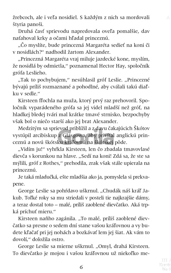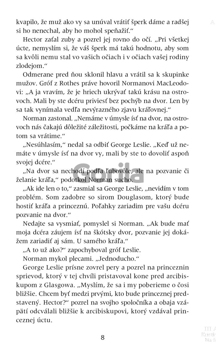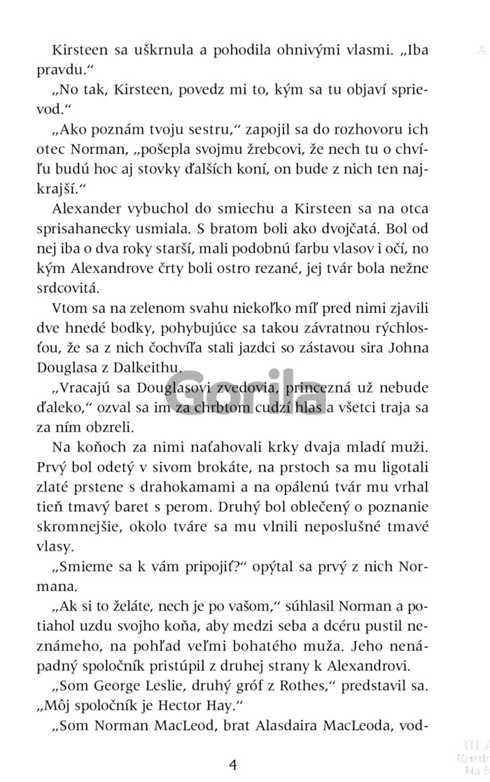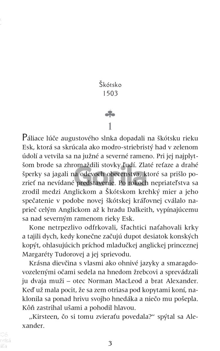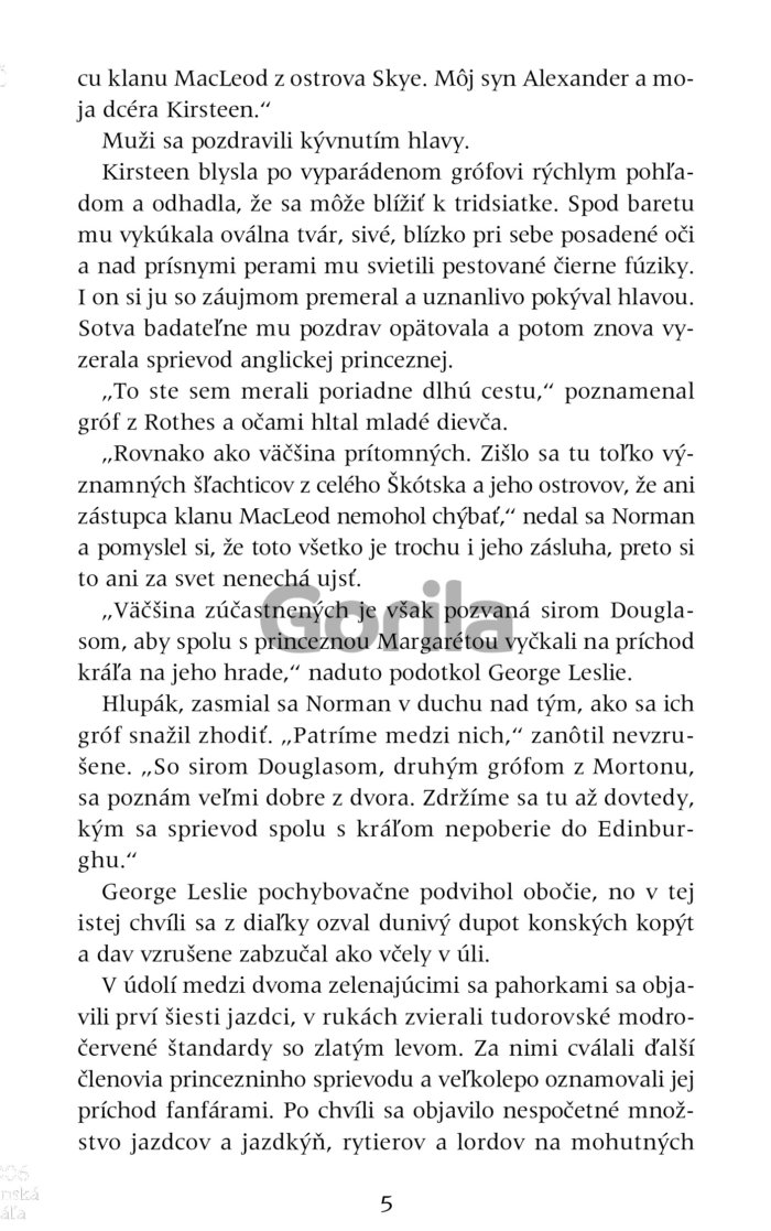Píše sa rok 1503. Pred hradom Dalkeith sa zhromaždia davy škótskych šľachticov a netrpezlivo čakajú na sprievod Margaréty Tudorovej, ktorá prichádza ako symbol krehkého mieru medzi Škótskom a Anglickom. Kirsteen MacLeodová z ostrova Skye víta budúcu škótsku kráľovnú spolu so svojím otcom Normanom a bratom Alexandrom. O pár dní dostane pozvanie od kráľa Jakuba, aby s kráľovským sprievodom odišla do Edinburghu a stala sa dvornou dámou a spoločníčkou mladučkej Margaréty.