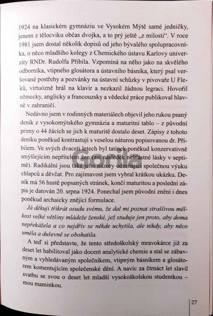 "Už mě nebaví pořád odpovídat na dotazy, zda jsem si k pacientkám někdy něco dovolil. A jak jsem to prý v mládí vydržel? Samozřejmě vydržel. Opak totiž hrozil průšvihem nebo svatbou. Bankovní úředník přece taky má rád peníze. V práci se jich pořád dotýká a skoro se s nimi mazlí. Ale běda tomu, kdo je použije k soukromým účelům! Jsou to peníze erární; mají stejný status jako ty krasavice v ordinaci."