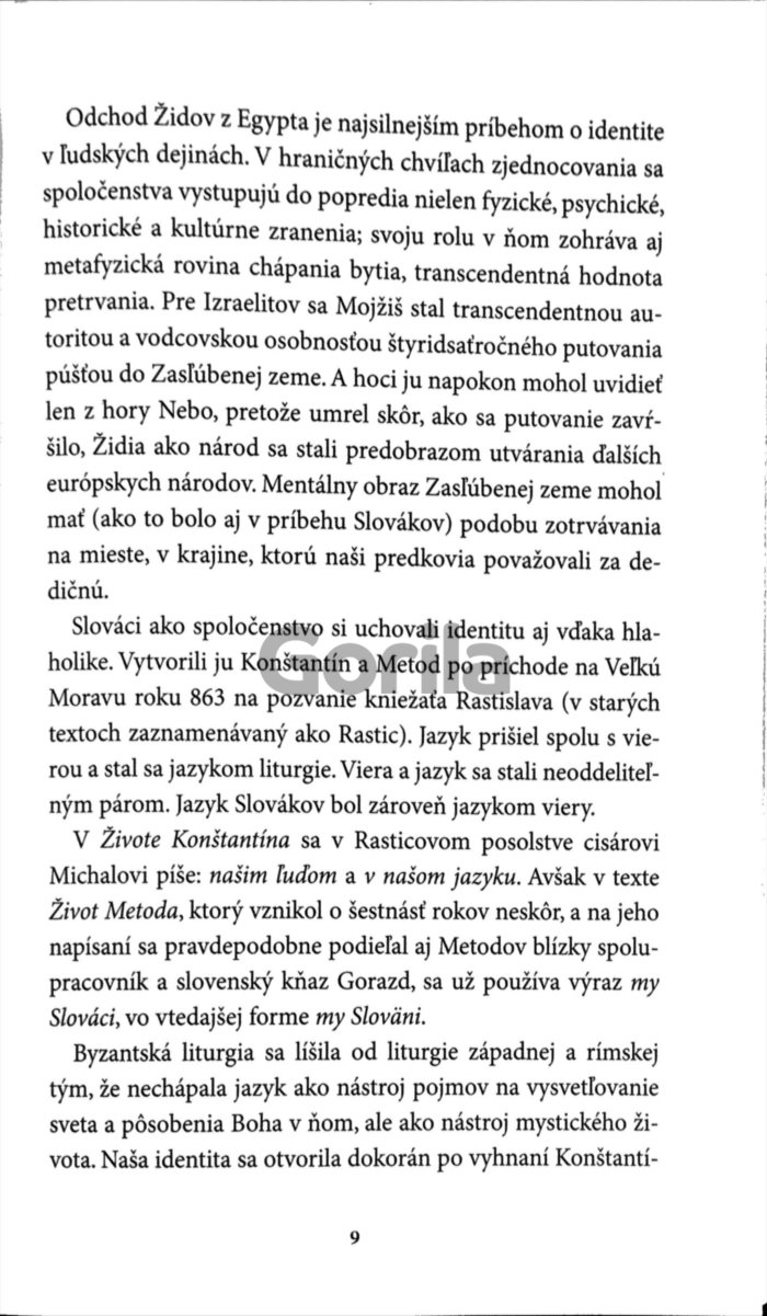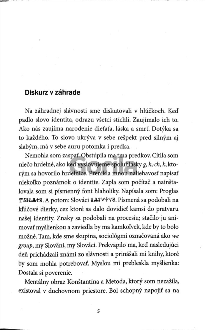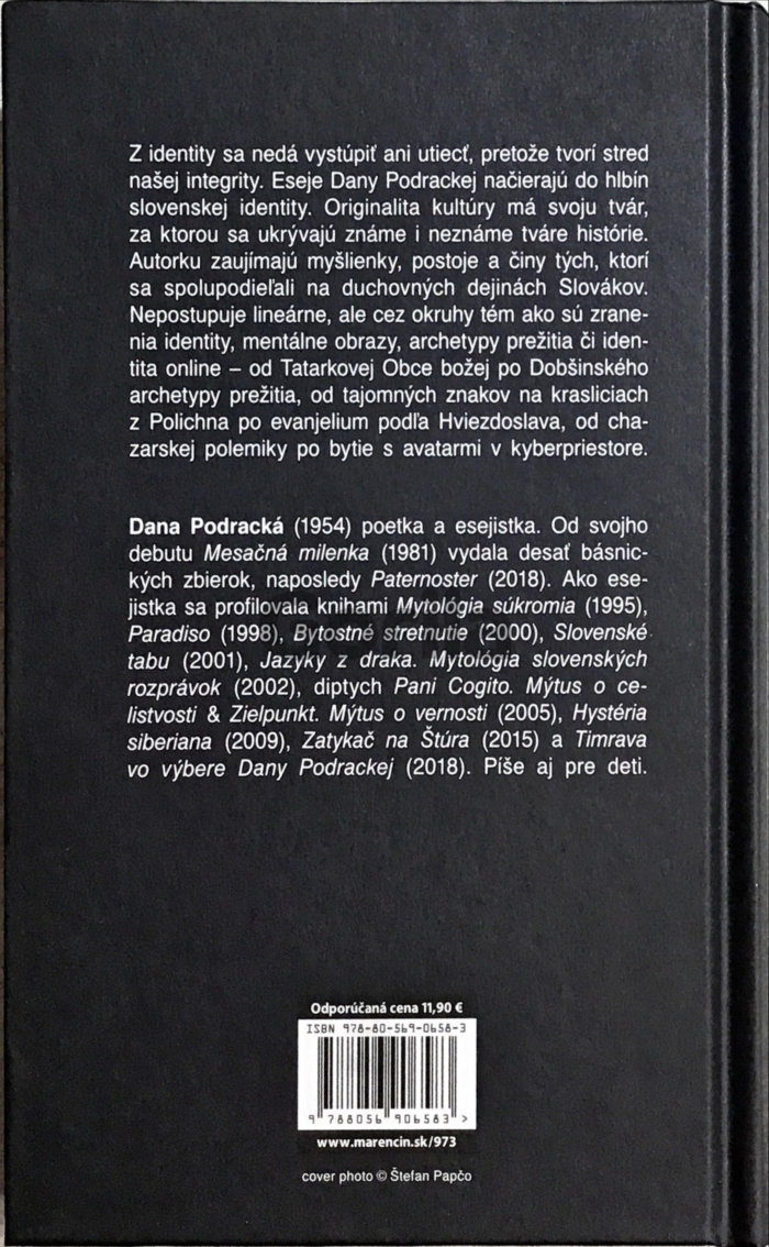Z identity sa nedá vystúpiť ani utiecť, pretože tvorí stred našej integrity. Eseje Dany Podrackej načierajú do hlbín slovenskej identity. Originalita kultúry má svoju tvár, za ktorou sa ukrývajú známe i neznáme tváre histórie. Autorku zaujímajú myšlienky, postoje a činy tých, ktorí sa spolupodieľali na duchovných dejinách Slovákov. Nepostupuje lineárne, ale cez okruhy tém ako sú zranenia identity, mentálne obrazy, archetypy prežitia či identita on-line – od Tatarkovej Obce božej po Dobšinského archetypy prežitia, od tajomných znakov na krasliciach z Polichna po evanjelium podľa Hviezdoslava, od charazskej polemiky po bytie s avatarmi v kyberpriestore.