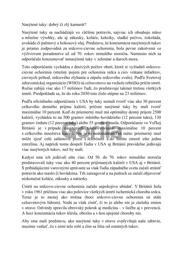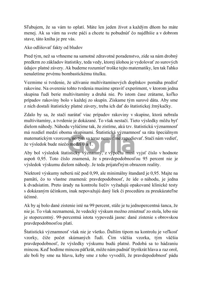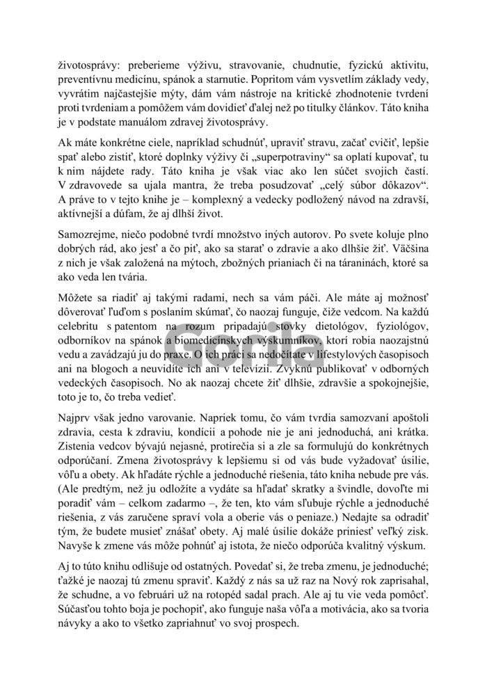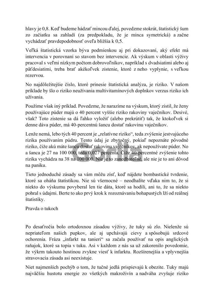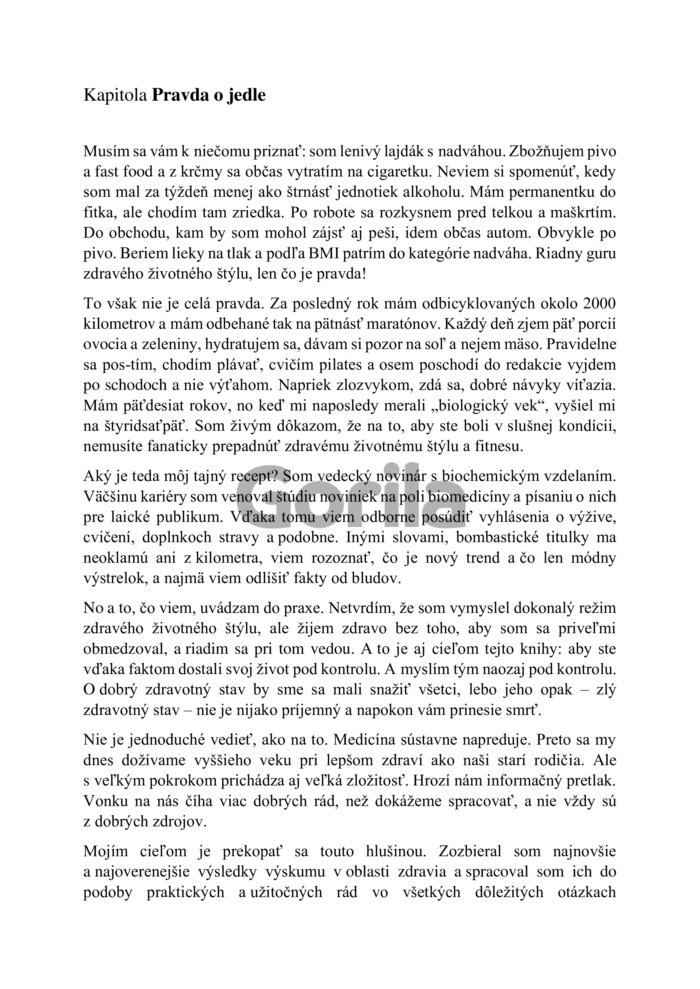 Zabudnite na divoké trendové diéty a fitnes programy celebrít. Vedecký publicista Graham Lawton prináša nový pohľad na zdravie, výživu a životný štýl. Oddeľuje dojmy od pojmov a kriticky sa vyrovnáva s množstvom mätúcich údajov a desivých titulkov v časopisoch. Na základe najnovších vedeckých výskumov a štatistík ponúka pravdu o diétach a stravovaní, o drogách, desaťtisíc krokoch denne, slanine, počítaní kalórií, káve, mliečnych výrobkoch, spánku, vláknine, „opiciach“, soli, cukre, kardiu, opaľovacích krémoch, statínoch, vitamínoch a o mnohom ďalšom.