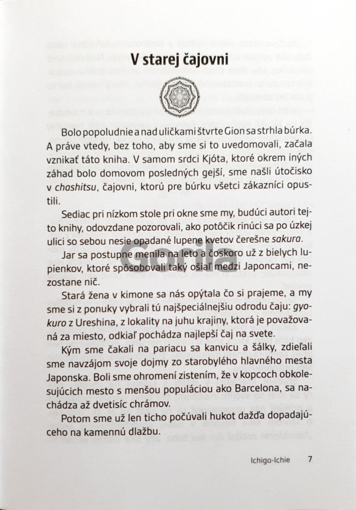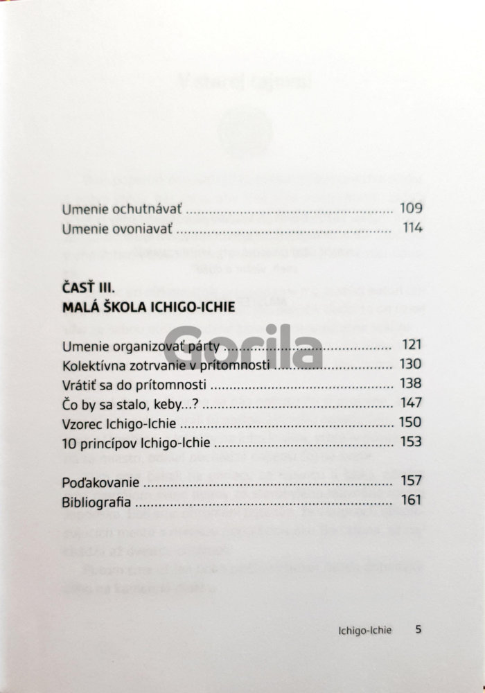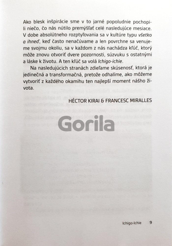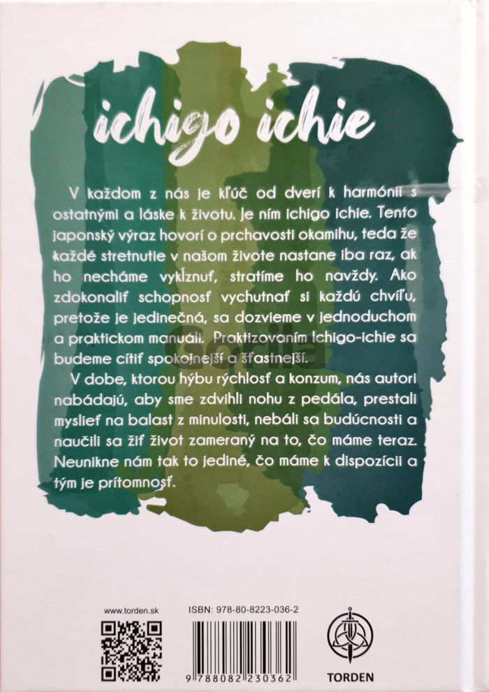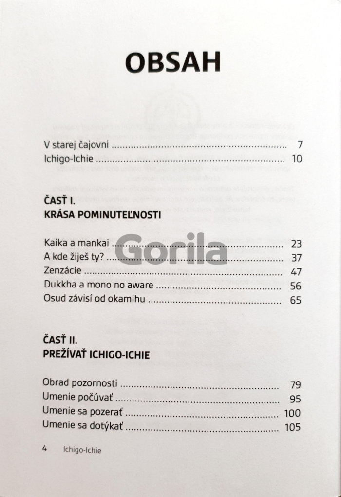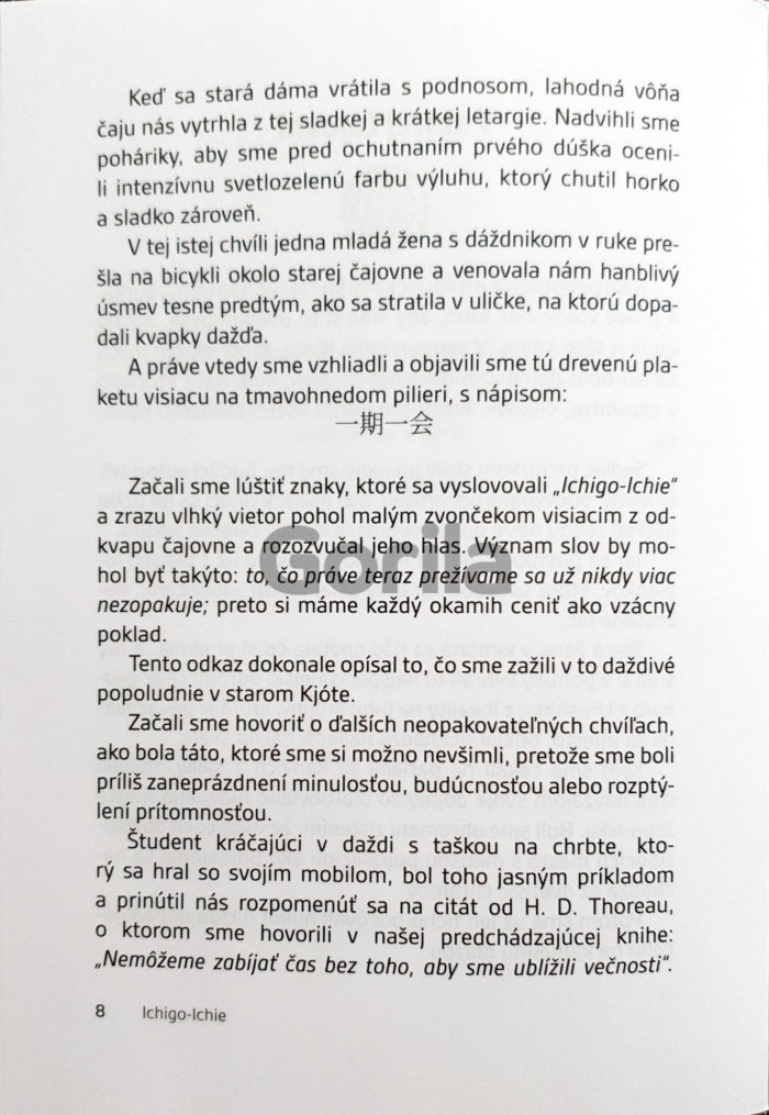 Každý okamih v našom živote nastane iba raz, a ak ho necháme vykĺznuť, stratíme ho navždy o to ide v myšlienke zachytenej japonskou frázou ichigo ichie (vyslovuje sa iči-go iči-a). Ako zdokonaliť túto schopnosť sa dozvieme v jednoduchom manuáli, praktickom a zároveň poetickom, aby sme sa naučili, ako urobiť každú chvíľu vzácnou a naučiť sa tajomstvá japonského carpe diem.