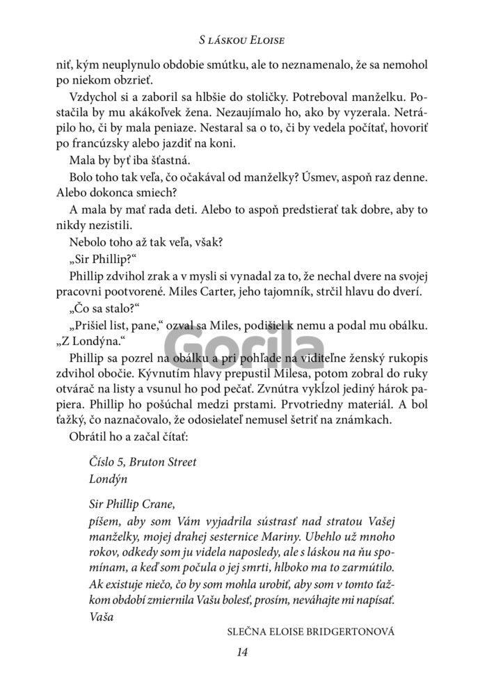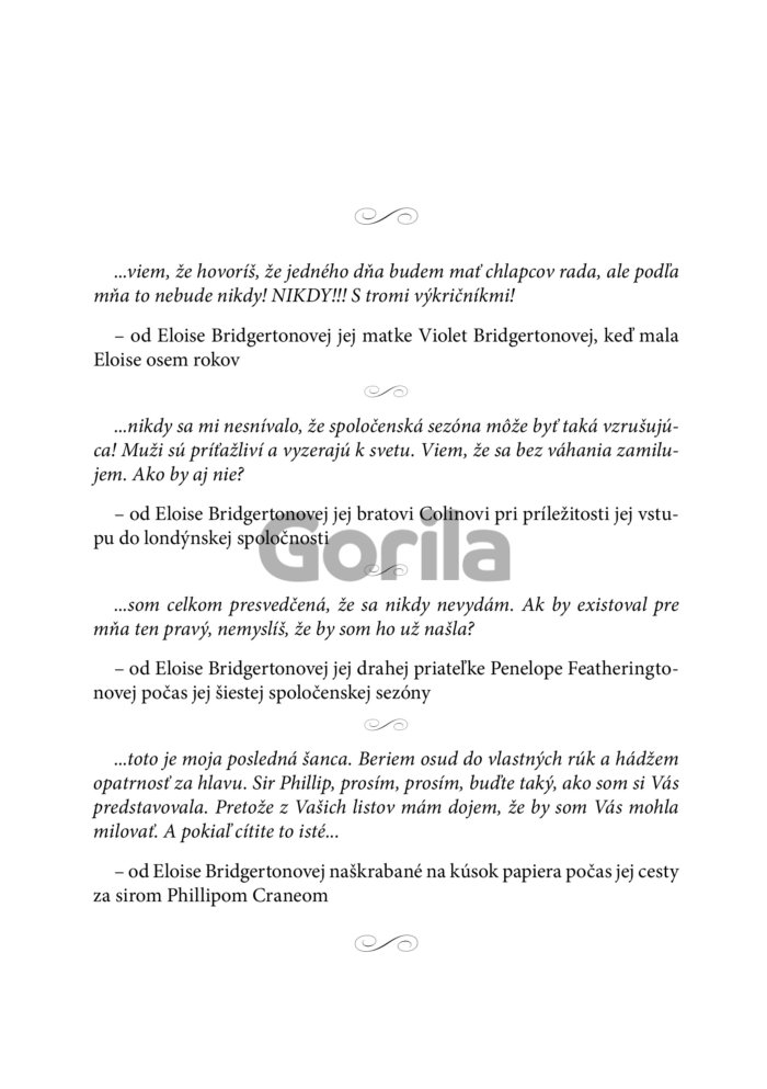 Eloise Bridgertonová premýšľa, či je naozaj takým bláznom, ktorý uprostred noci nasadne na drožku a uháňa do neznáma. Vyzeralo to tak, že na konci jej bezhlavej cesty bude muž, ktorého si s radosťou vezme za muža. Nie je. Je všetko iné, len nie muž, ktorý by aspoň zďaleka pripomínal londýnskych gentlemanov, čo ju žiadali o ruku. A aby toho nebolo málo, je tu jedna skutočnosť, ktorú jej zamlčal...