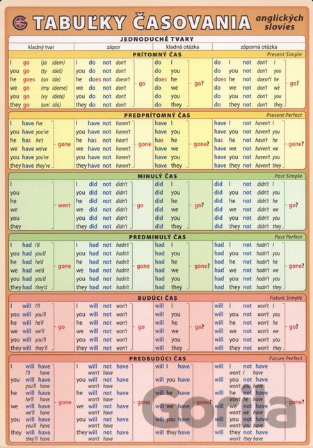 Prehľadné tabuľky všetkých dvanástich anglických časov. vyčasované sloveso go (ísť) kladný tvar, zápor, kladná otázka, záporná otázka farebné vyznačenie koncoviek a nepravidelností