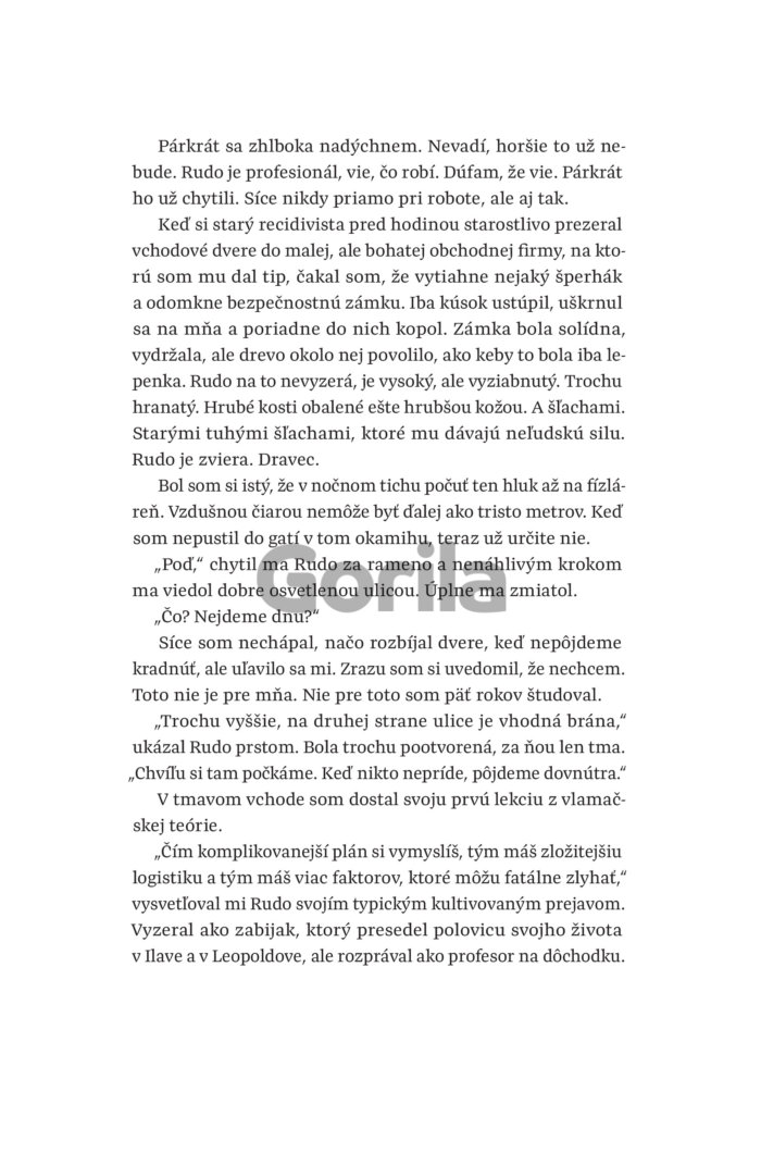 Zlodej sa odohráva v rovnakom vesmíre ako Soltészove romány Mäso a Hnev, ale ukazuje ho z pohľadu jedinej postavy. Novinár Pali Schlesinger sa v ňom mihne iba ako pohŕdavá poznámka pod čiarou, na sympaticky drsného policajta Mikiho Mika sa díva očami jeho obete a privatizéra Aďa Šípoša poľudští uhol, z ktorého ho vidia priatelia z detstva. Len mafiáni zostávajú stále rovnako násilnícki a tupí.